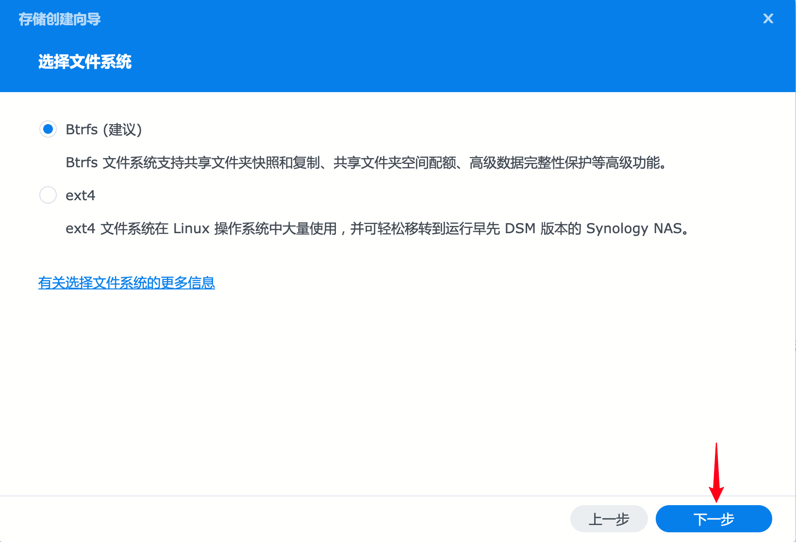 “选择文件系统”这里有两个选择,根据实际情况选择,如果想要使用群晖系统所有功能不受限制的,选”Btrfs”,下一步;